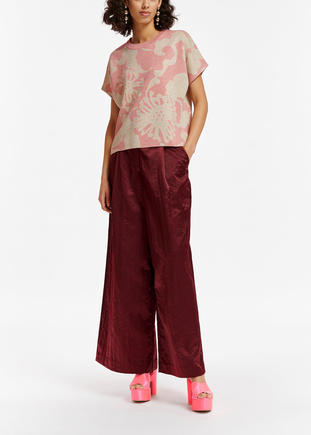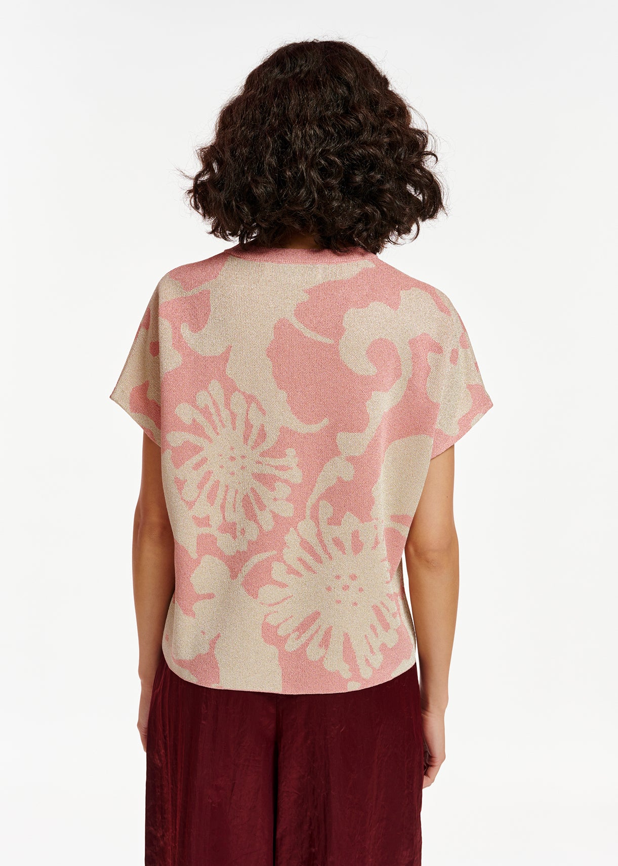 Ce tricot jacquard à motif fleuri présente une encolure ronde classique, des manches courtes et une coupe décontractée confortable. La silhouette est résolument sobre et minimaliste, car les fibres métalliques ajoutent une touche de brillance. Tricot de poids moyen Modèle qui se porte décontracté Lurex Beige/Vieux rose; sku: DEREMO; material: 54% viscose 32% polyester 14% fibre métallique