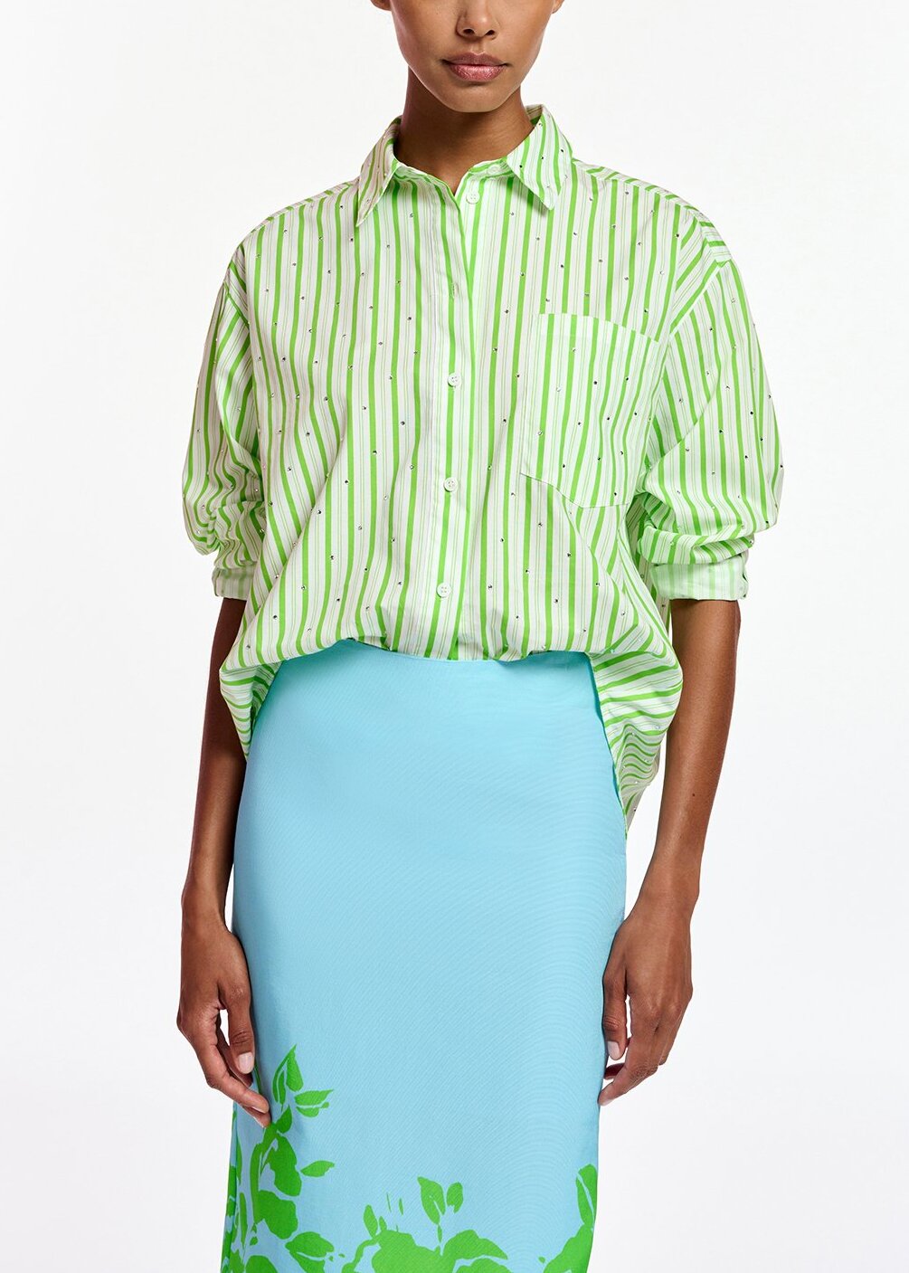 Chemise en popeline de coton à rayures qui présente un ourlet incurvé, un col pointu habillé et des manchettes classiques. La silhouette oversize est agrémentée d'ornements en strass pour une touche d'éclat.; sku: FEVERTREE-F2GL-M; material: 100% coton