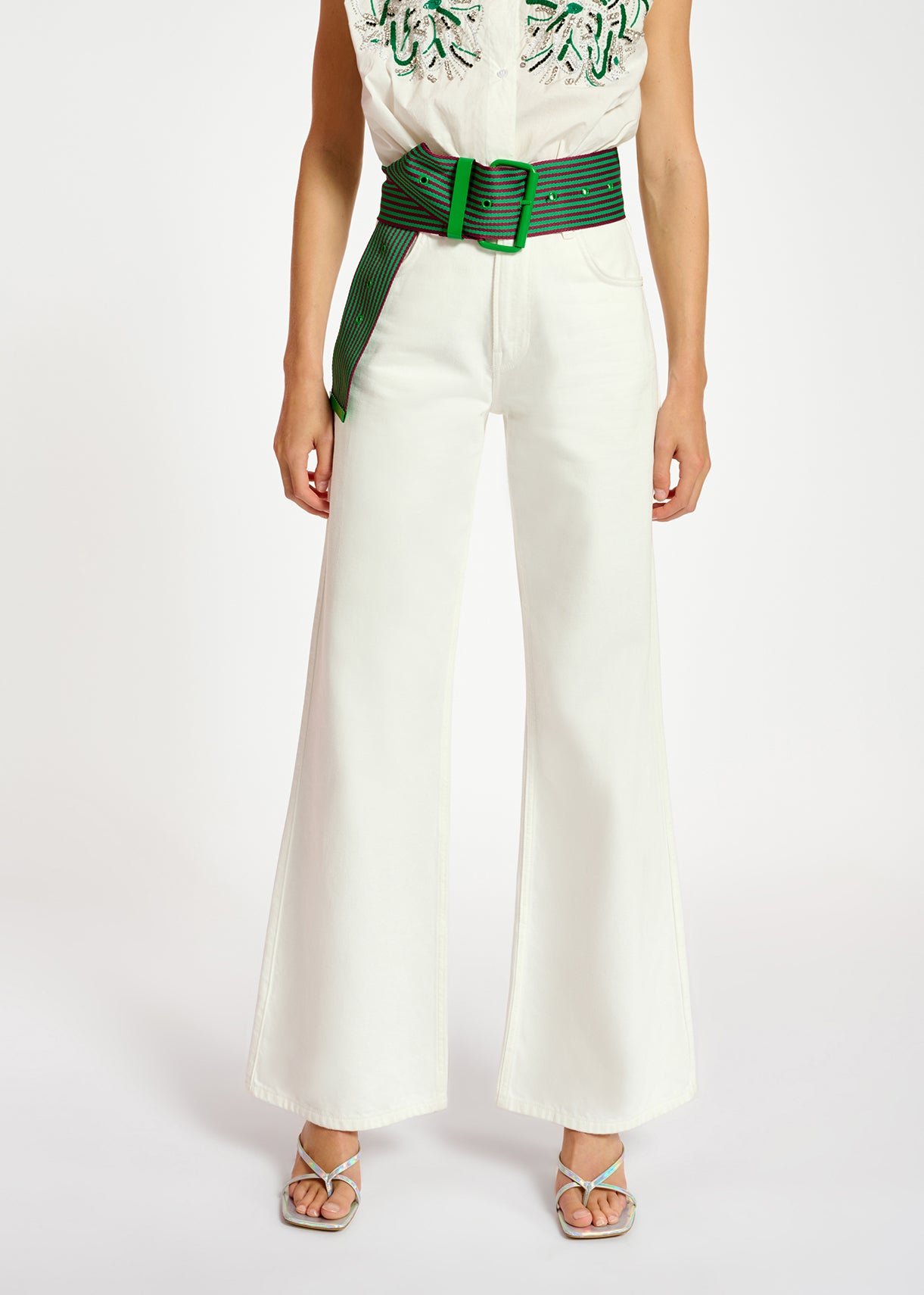 A year-round classic, these relaxed high-waisted jeans are cut from eco-responsibly produced cotton denim. The pair is constructed with five pockets and has a straight fit throughout the legs with a subtle kick flare at the hems. 100% cotton Mid-weight, non-stretchy denim Designed for a relaxed fit High rise Straight leg with a subtle kick flare Zip and button fastening Five pocket construction Belt loops Produced in an eco-responsible way White; sku: DEW; material: 100% cotton pocket lining: 100% cotton